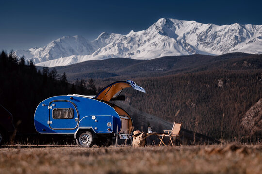 Blue trailer camper set against majestic snowy mountain landscape, vanlife concept