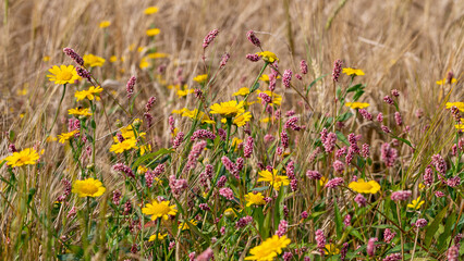 Fleurs mellifères dans un champ de blé. Chrysanthème des moissons et renouées persicaire.