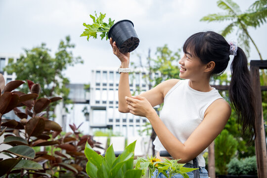 Asian woman holding a propagated green plant showing aerial roots in the greenhouse before buy ornamental products. Check quality plants and growths