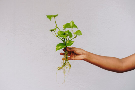 Hand holding a bunch of propagated Pothos plant showing aerial roots and green foliage against white background