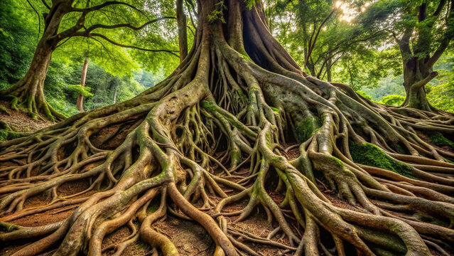 A massive tree's complex root system sprawls deep underground, with thick, gnarled tendrils and delicate, hair-like fibers weaving through dark, rich soil and weathered stones.