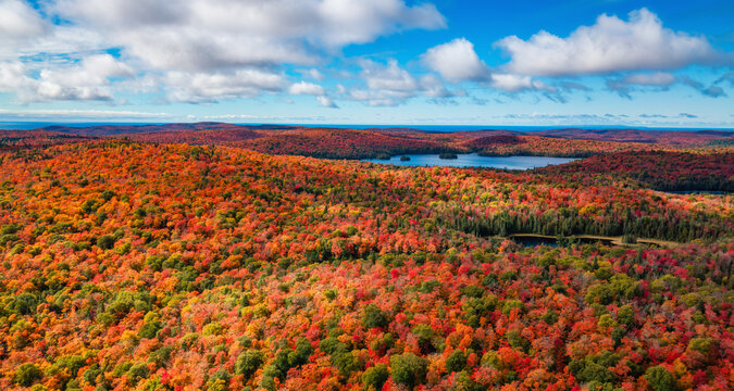 Colorful Trees in forest with lakes and blue cloudy sky. Aerial Nature Background