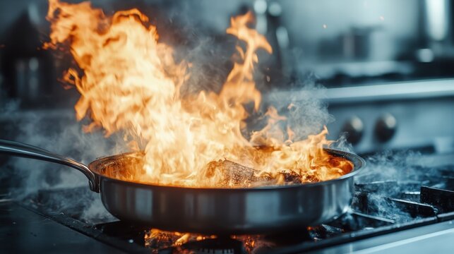 A frying pan with high flames and smoke in a kitchen setting, representing a cooking mishap or high-heat culinary technique, with intense and dramatic energy.