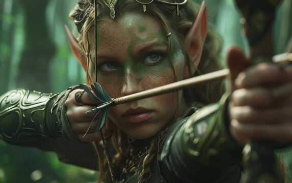 A elf woman is holding a bow and arrow in a dynamic scene. The Hunts on fantasy animal from fairy tales. Trendy fantastic movie color retouch.