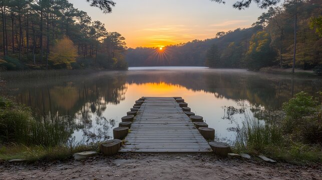 Sunrise over the lake with a wooden dock and trees in the background at a nature spot
