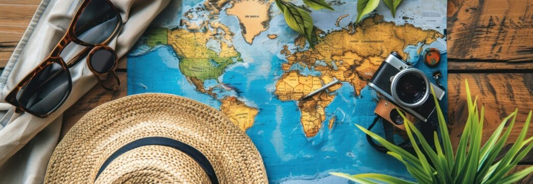 A traveler's essentials a straw hat, camera, leather bag, and map rest on a table overlooking a bustling city street.  The scene evokes adventure and exploration.