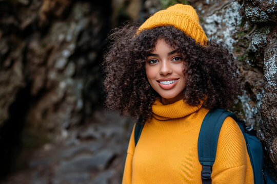 Young woman with curly hair wearing a bright yellow sweater and hat, smiling while hiking through a rocky area. Her cheerful expression and outdoor attire indicate a joyful adventure in nature.