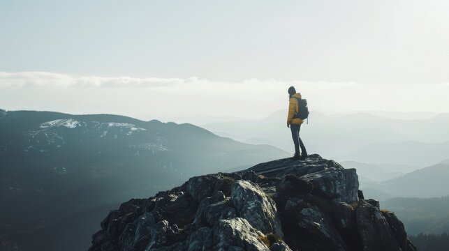 An adventurer stands triumphantly on a rocky peak, overlooking a vast expanse of mountains under a clear, blue sky.