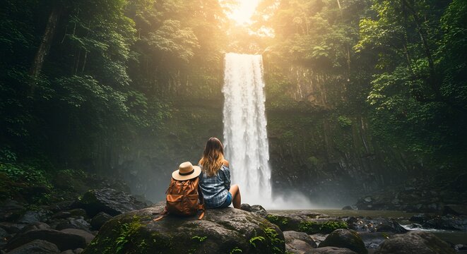 Solo Traveler Sitting by a Waterfall, Surrounded by Nature