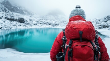 A lone hiker stands in awe at a serene snowy landscape with a beautiful turquoise lake surrounded by majestic mountains, showcasing the beauty of nature and adventure.