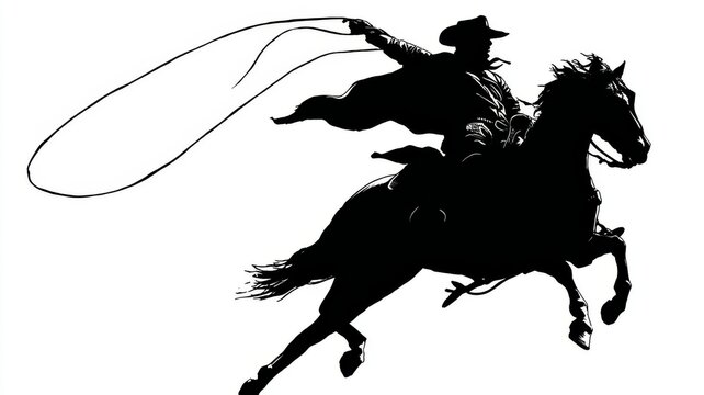Silhouette of a wild west cowboy riding a galloping horse holding a lasso in hand vector illustration on white background