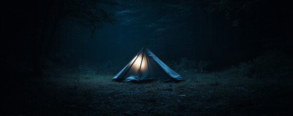 A clean, dramatic, moody shot of a single, simple tent/campfire (focused object) illuminated softly at night in a dark, empty forest, solitude, camping, cinematic light