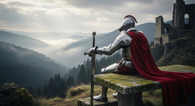 Medieval knight in shining armor with a red cape sitting on a stone bench overlooking a misty mountain landscape with ancient castle ruins and lush forests in the background during daytime