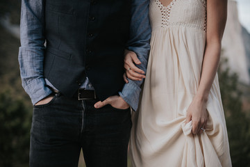 Romantic couple in sleeping bags enjoying bivouac in Norway mountains, friends man and woman hiking with camping travel gear, Valentines day outdoor vacations active healthy lifestyle adventurous trip