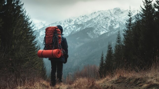 The adventurous hiker overlooking a majestic mountainous landscape with snow-capped peaks