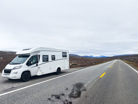 Exploring the nordic landscapes: a white camper van on a scenic road in norway, heading towards the arctic circle for an adventurous journey
