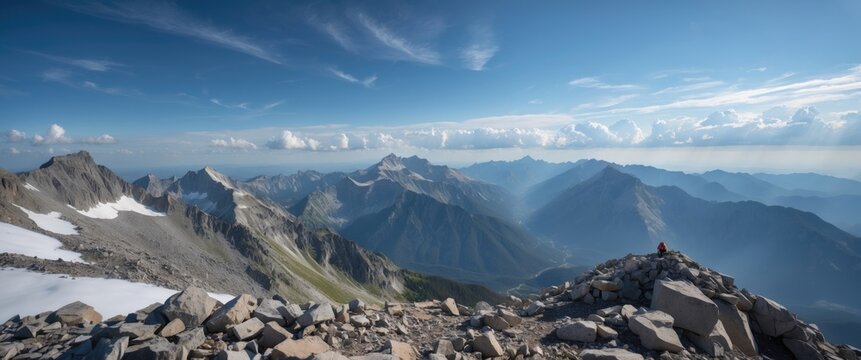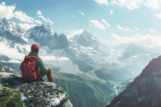 An adventurous traveler enjoys a moment of tranquility, seated on a mountain ledge, gazing out at the expansive mountain range, with ample space for custom text or branding.