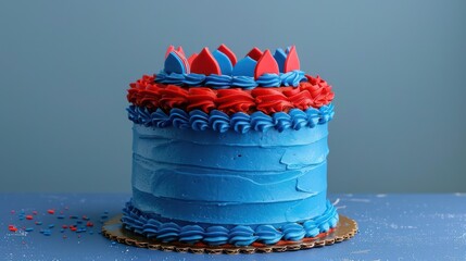 playful superhero cake with bold red and blue frosting on a royal blue background, ideal for adventurous text