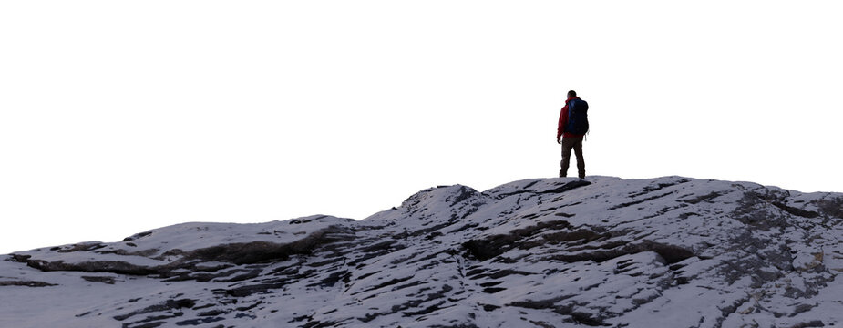 Adventure Man Hiker standing on top of Snowy, Rocky Mountain Peak. PNG Cutout. 3d Rendering.