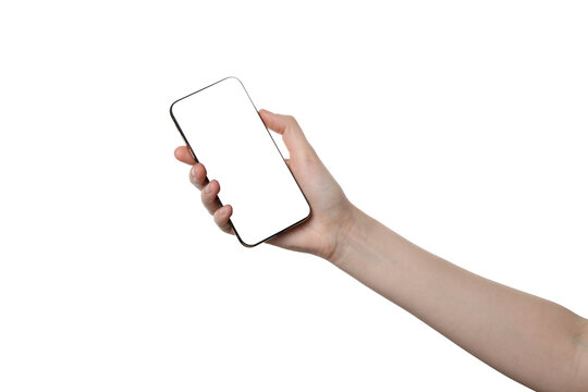 Black female hand holding smartphone with blank screen isolated on white background. Panorama with empty space