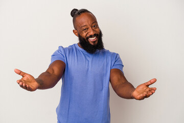 Man with beard and green shirt holding copyspace imaginary on the palm to insert an ad