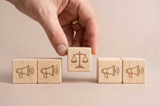 Concept of honest marketing ethics building consumer trust with hand placing wooden block with scale icon among megaphones