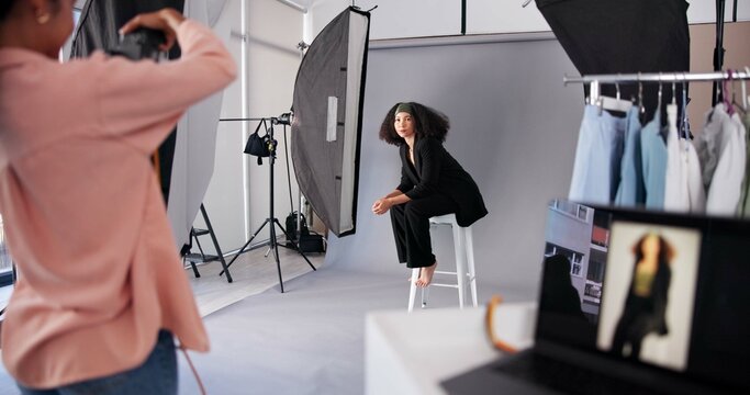 Fashion, woman and photographer with model in studio for magazine photoshoot, media or picture. Camera pose, professional photography or production process on set, creativity and designer advertising