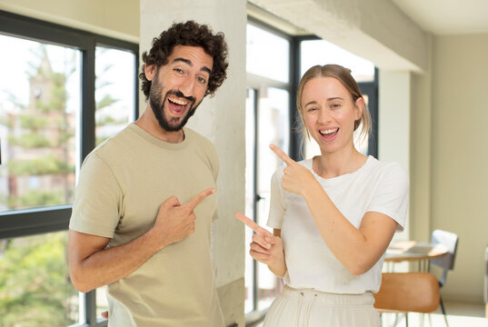 young adult couple smiling cheerfully and pointing to copy space on palm on the side, showing or advertising an object