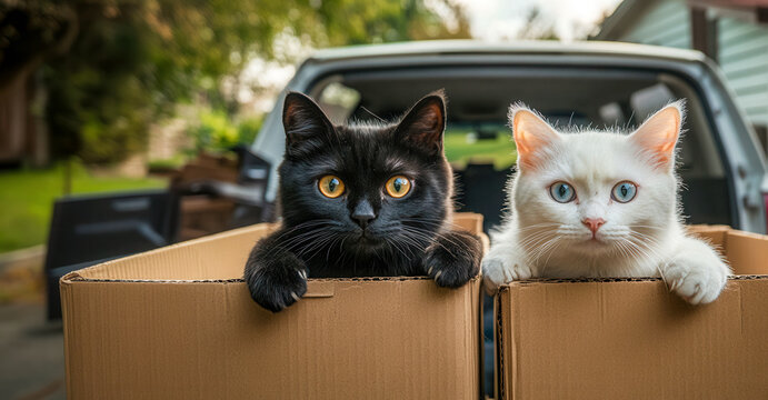 A funny poster of a black and white cat in cardboard boxes in the back of a pickup truck, moving to a new home, a concept for advertising a transport company and cargo delivery
