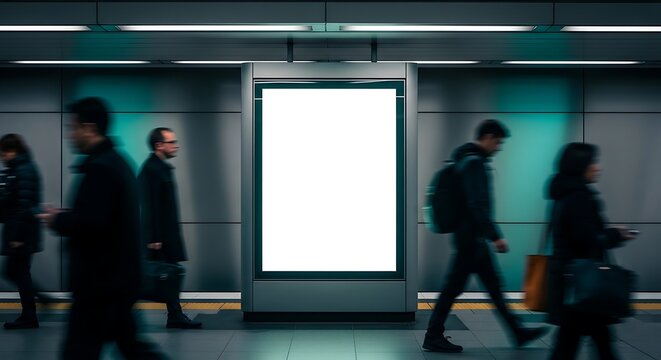 An empty blank billboard or advertising poster positioned in a bustling train station, surrounded by blurred figures of people moving in the background.