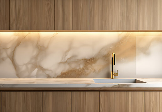 A modern kitchen setup with marble backsplash, wooden cabinets, and a well-lit countertop. Generative AI