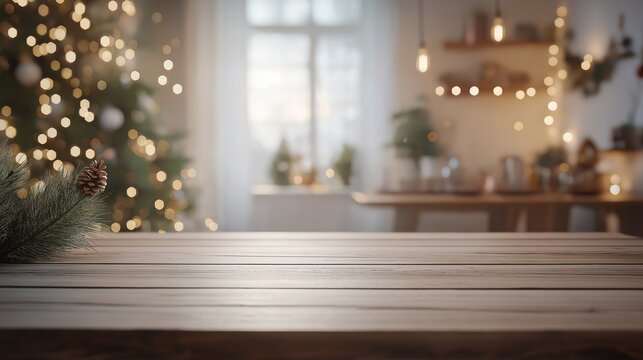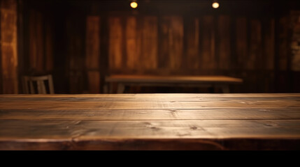 Brown wooden table top with copy space for product advertising over blurred kitchen background with window at home