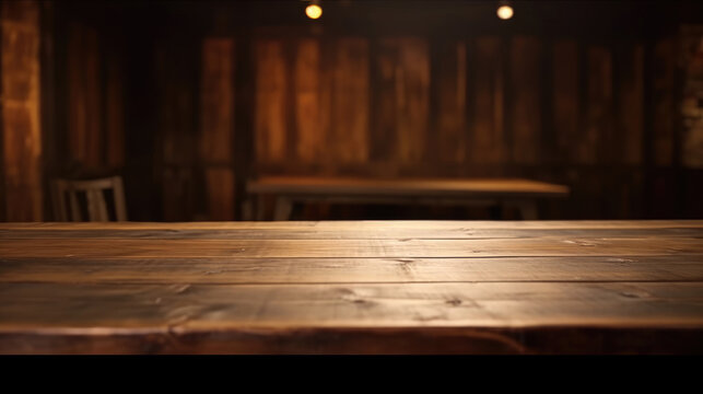 Wooden table corporate office bokeh background, empty wood desk surface product display mockup with blurry abstract business city view work backdrop advertising presentation. Mock up, copy space.