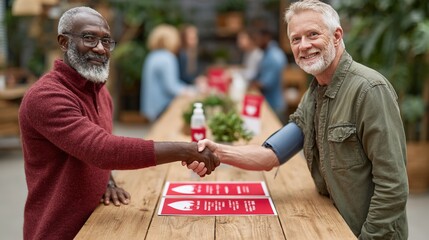 Elderly male caucasian and african shaking hands after health check in community center