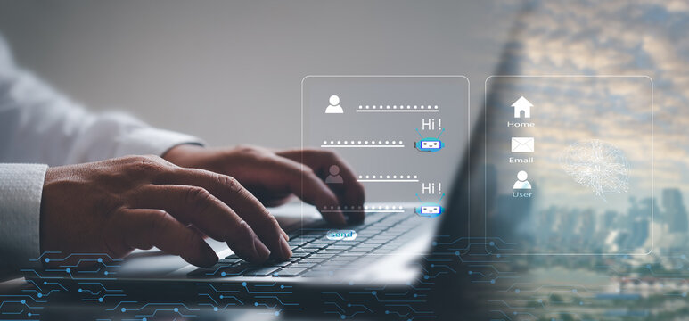 Chatbot concept. open AI, Artificial Intelligence. businessman using technology smart robot AI, enter command prompt, contact for business information analysis, Futuristic technology transformation.