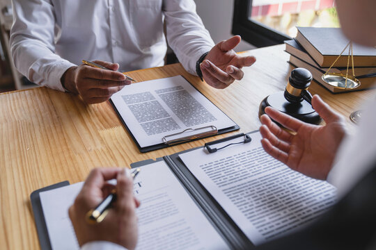 The lawyer working with a client discussing contract paper, a Business lawyer working about legal legislation in the courtroom to help their customer