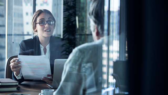 Smiling couple professional meeting financial advisor reviewing documents at table in office