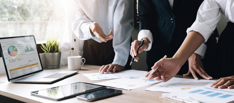 An analyst uses a computer and dashboard for data business analysis and Data Management System with KPI and metrics connected to the database for technology finance, operations, sales, marketing