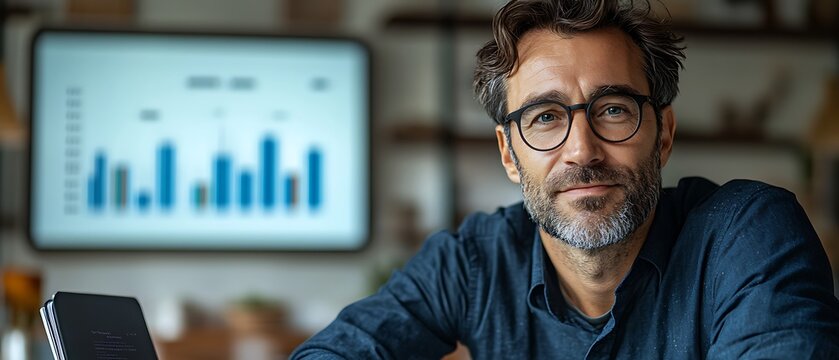 Confident Executive: A focused, bespectacled executive sits in front of a digital display showcasing analytical data. Displaying confidence and business acumen.