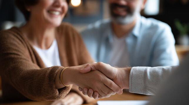 Couple meeting financial advisor at residence faceless clients and consultant defocused home background handshake agreement moment finance insurance advice property investment