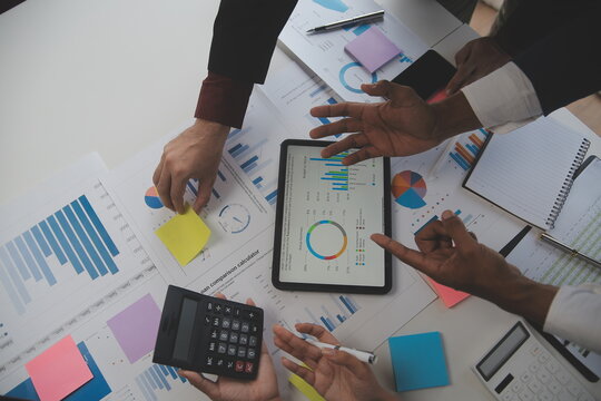 Financial analysts analyze business financial reports on a digital tablet planning investment project during a discussion at a meeting of corporate showing the results of their successful teamwork
