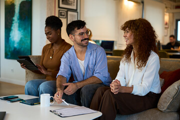 Skilled real estate agent guides couple through property purchase agreement at home offering expert advice on residential investment