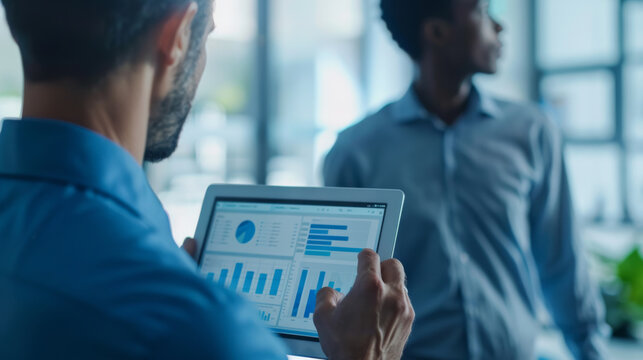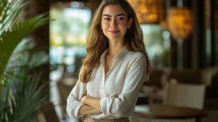 A focused businesswoman stands confidently during a meeting with her team in a contemporary office setting.