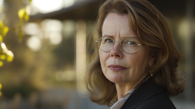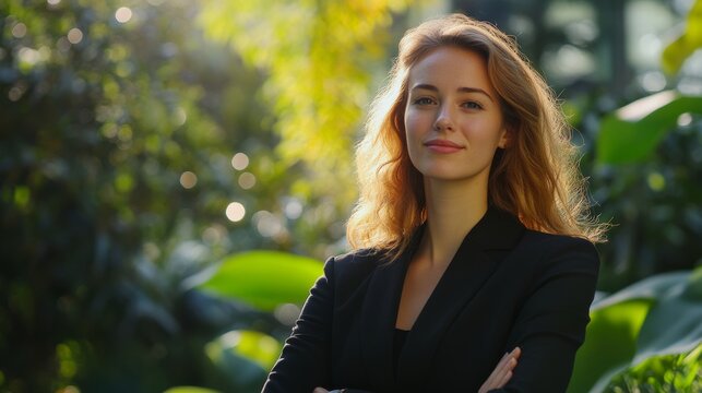 Business woman exudes confidence while working outdoors, highlighting her professional demeanor in natural light
