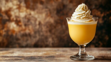 Glass of golden Advocaat cocktail topped with swirled whipped cream, served on a rustic wooden surface against a blurred background