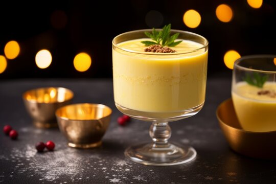 Eggnog alcoholic beverage served with cinnamon or nutmeg.  Traditional drink often served during Christmas