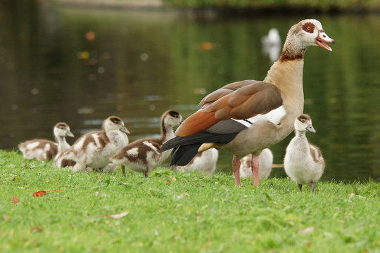 Egyptian geese (Alopochen aegyptiaca) with goslings walking in a park