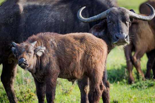 Young cape buffalo calf stands next to mother