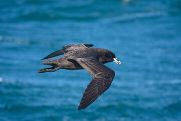 Petrel in flight. The white-chinned petrel or Cape hen.  Scientific name: Procellaria aequinoctialis. South Africa.