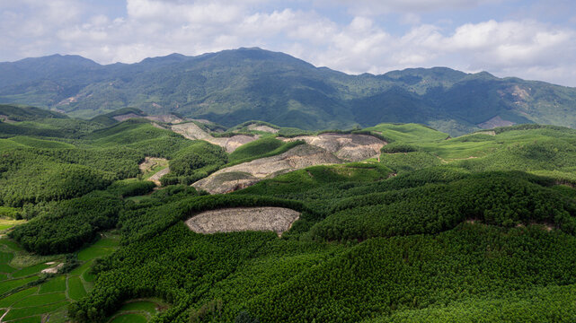 Aerial view of deforestation in a lush green mountain area showing patches of cleared land amidst dense forests, background with a place for text